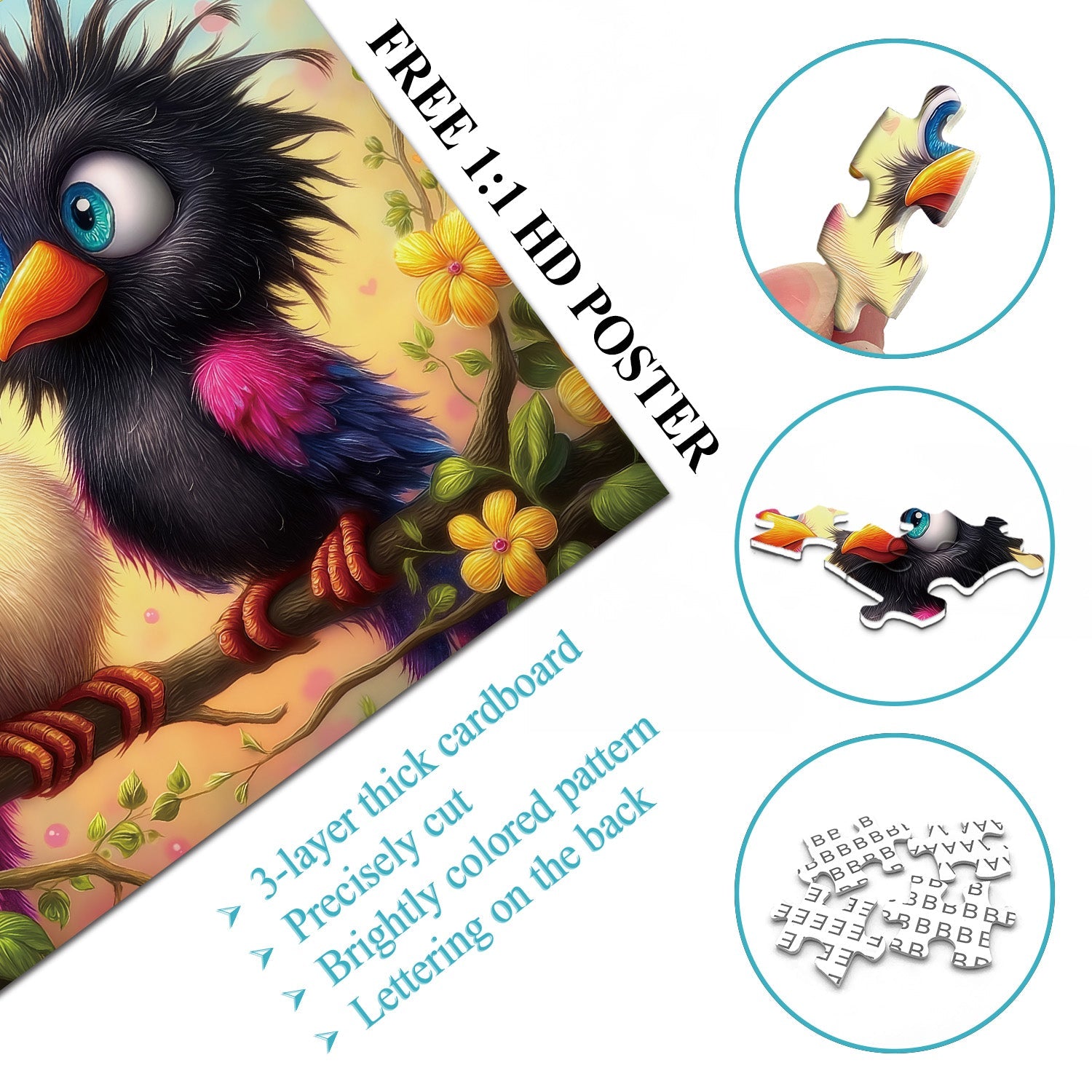 Grandi occhi azzurri espressivi: Entrambi gli uccelli presentano grandi occhi azzurri luminosi con pupille dettagliate, che conferiscono loro un'espressione giocosa e accattivante che enfatizza il loro fascino da cartone animato.