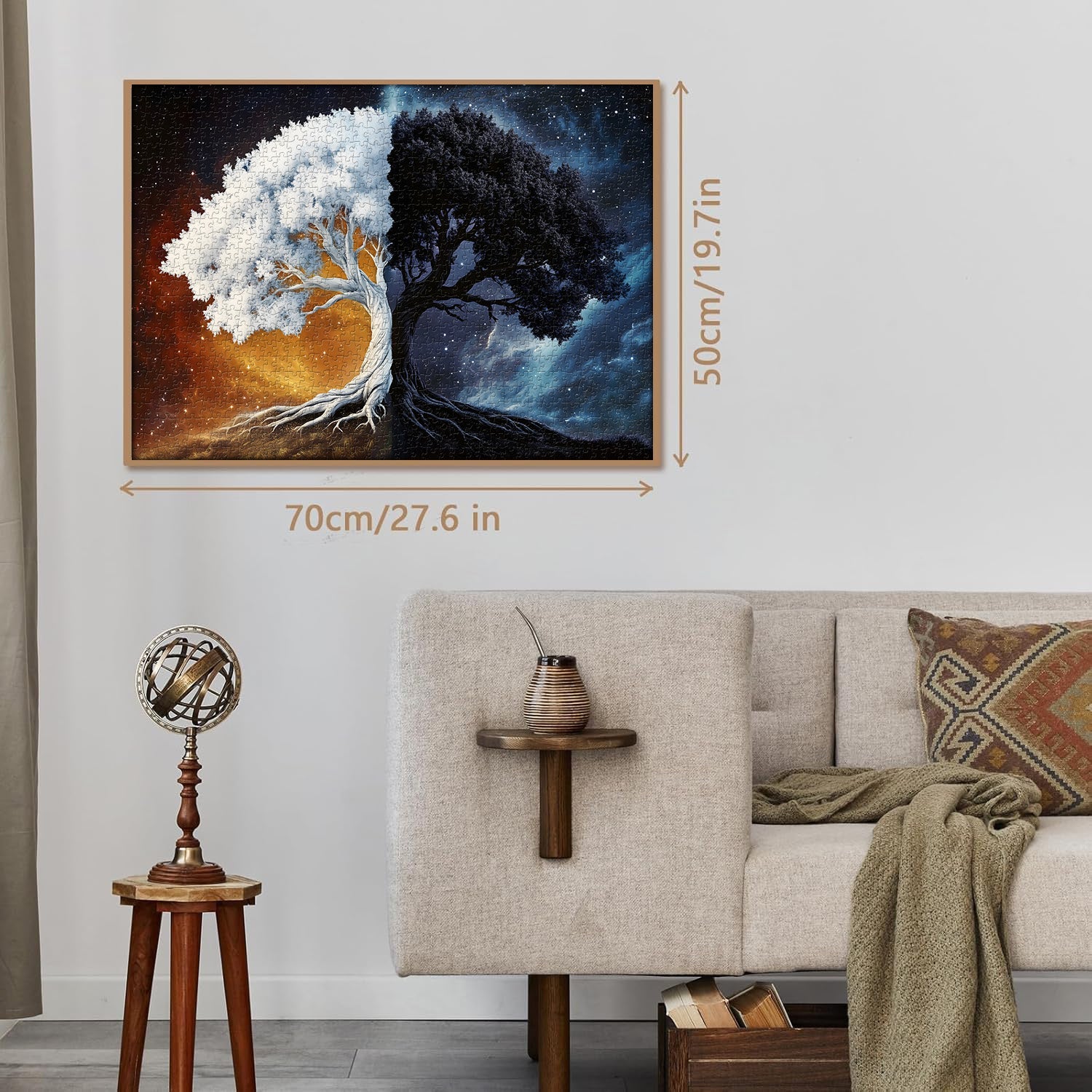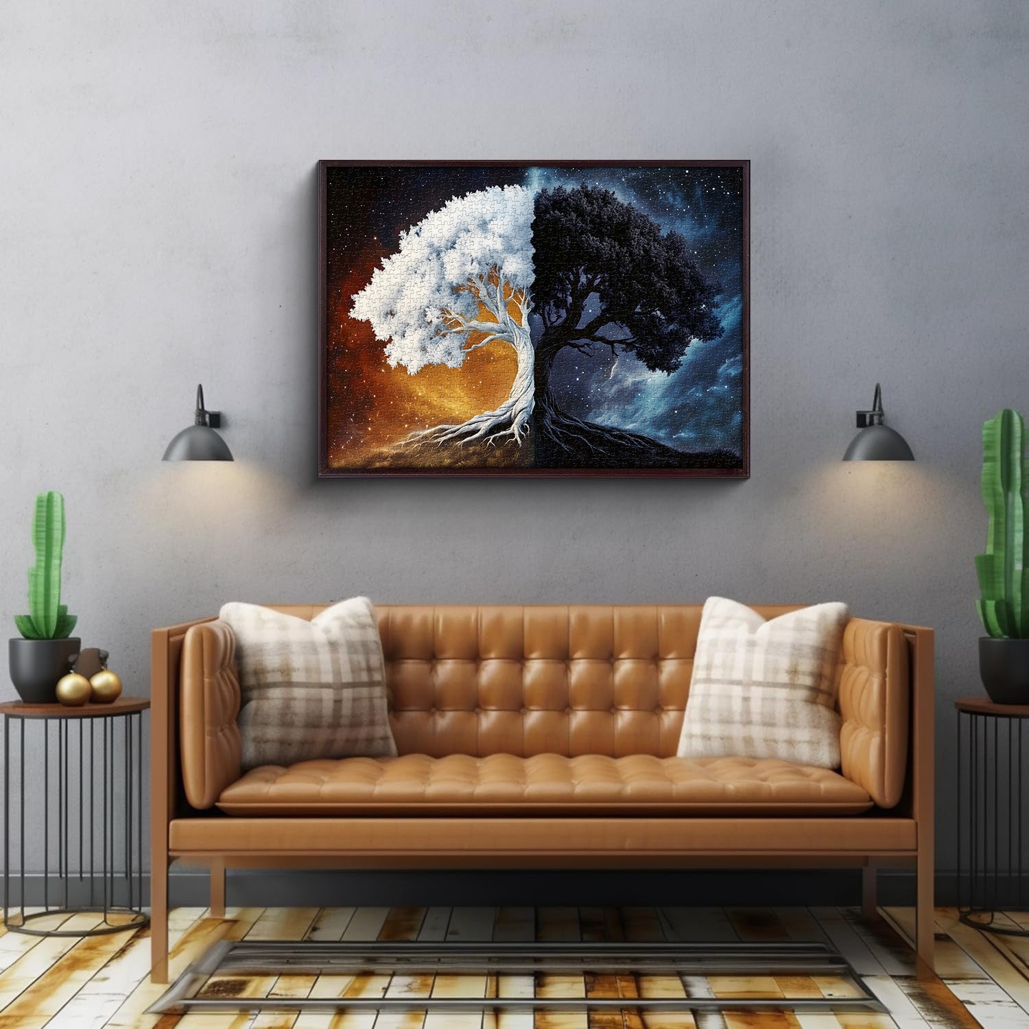 Yin-Yang Tree Design: The focal point is a split tree (half bright white, half deep black), mirroring the Yin-Yang concept to symbolize balance between light and dark.