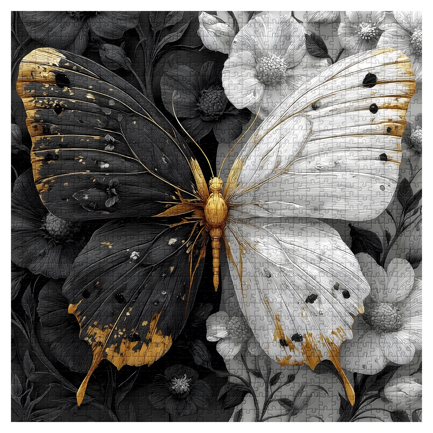 Dichromatic Butterfly Design: The focal point is a butterfly with a split black-and-white wing pattern (one side deep black, the other crisp white), accented with shimmering gold details (edges, body, spots) for contrast.